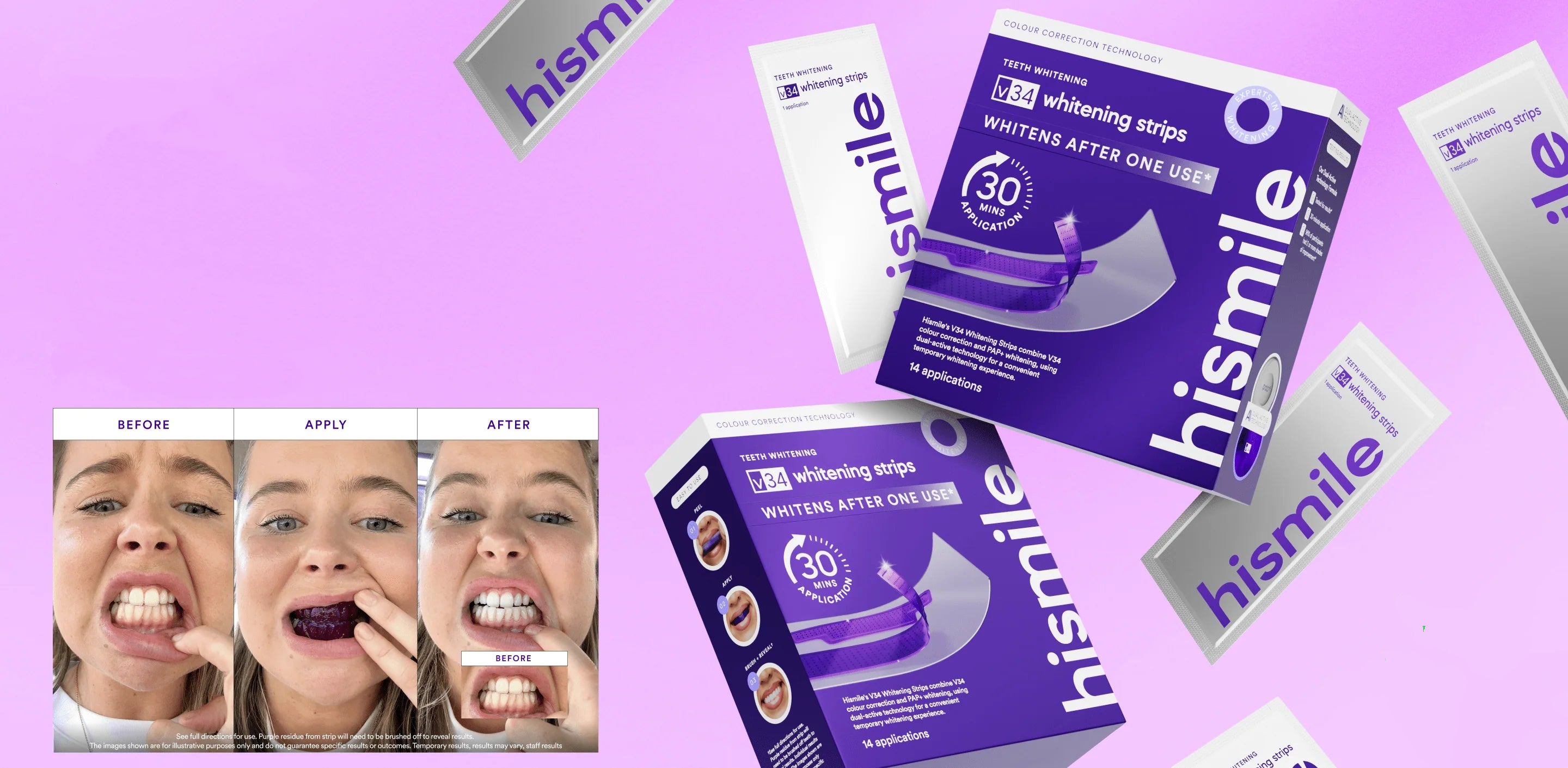 Hismile's New V34 Teeth Whitening Strips, combining V34 Colour Correction Technology with PAP+ Whitening to achieve Whiter Teeth After Just One Use