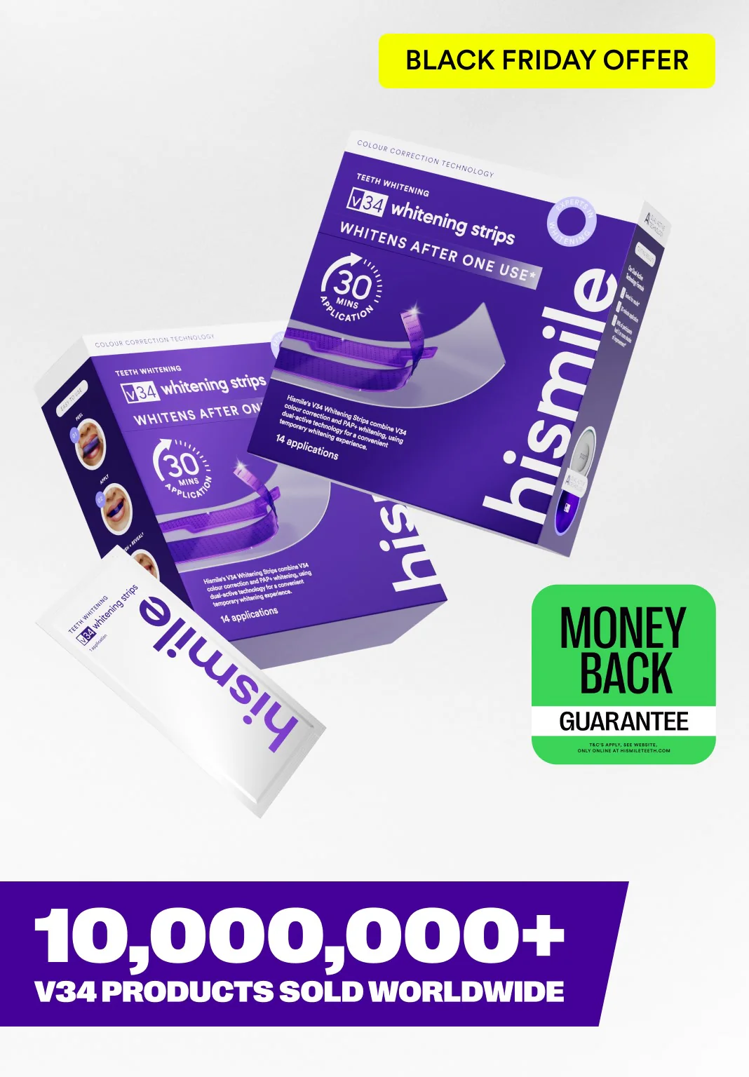 Hismile's New V34 Teeth Whitening Strips, combining V34 Colour Correction Technology with PAP+ Whitening to achieve Whiter Teeth After Just One Use