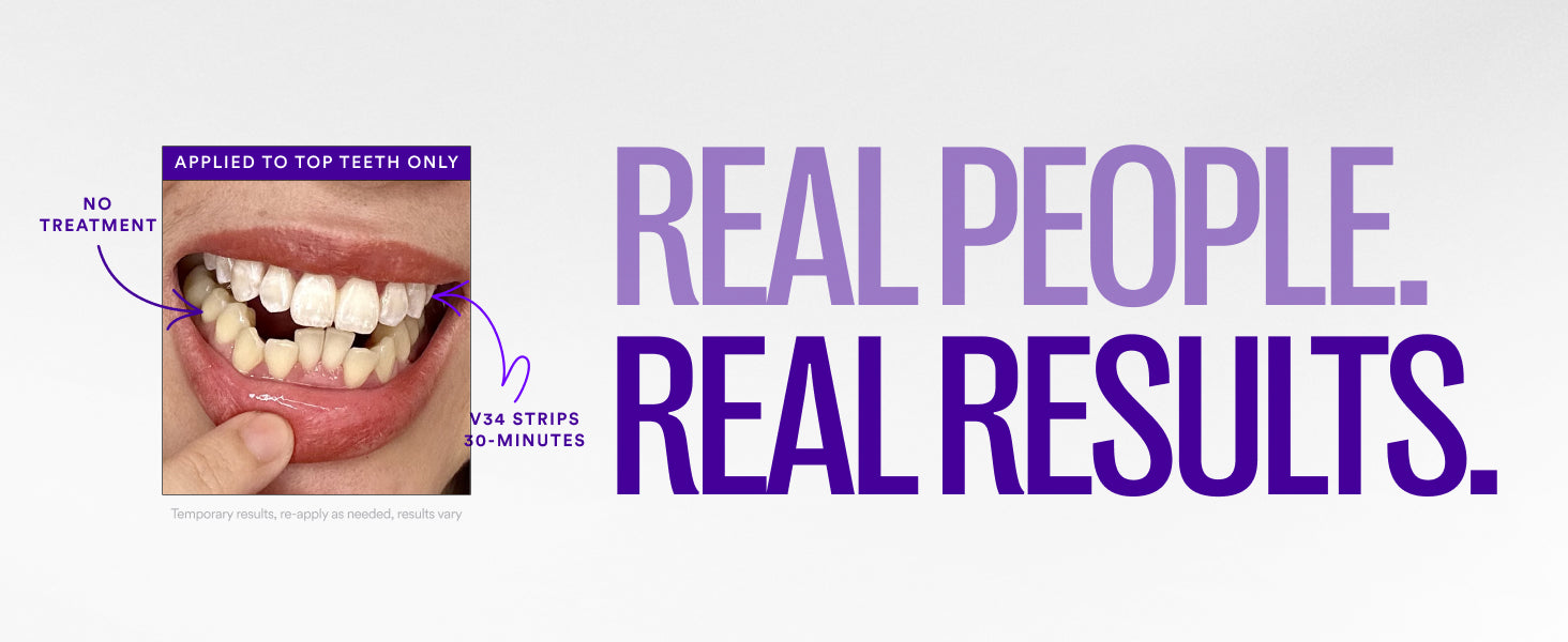 The V34 Whitening Strips combine gentle whitening ingredients with purple colour-correcting technology. The purple tone helps neutralize yellow hues on the teeth, creating an instant brightening effect.
